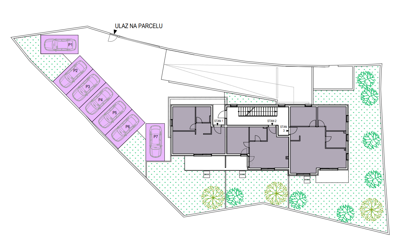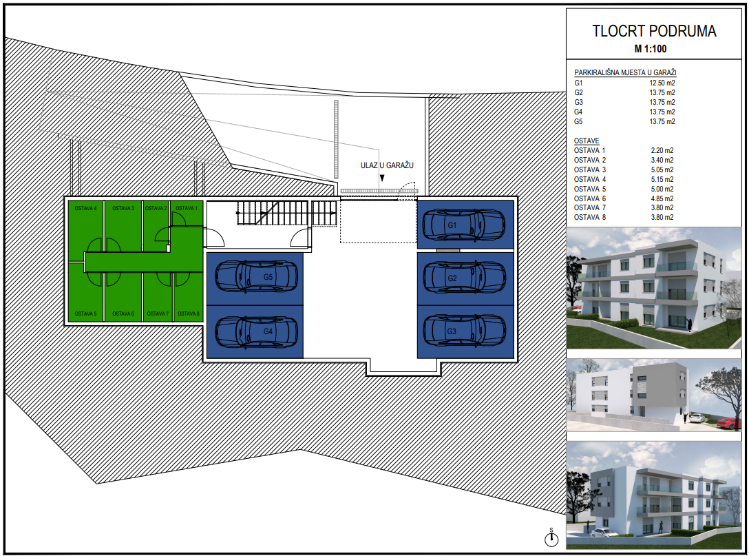 Stambena zgrada se sastoji od vrta, 7 vanjskih parkirnih mjesta, 8 stanova raspoređena na tri kata i podruma s 5 garažnih mjesta i 8 ostava.