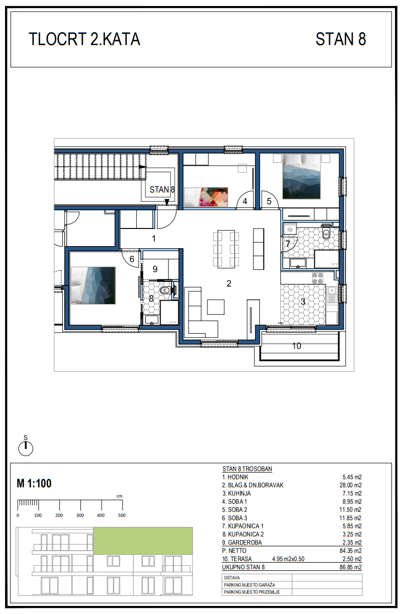 Stan površine 84,35 m2 smješten je na drugom katu i sastoji se od prostranog dnevnog boravka i blagavaonice s kuhinjom koji imaju izlaz na balkon od 4,95 m2, kupaonice, tri spavaće sobe od kojih jedna ima vlastitu kupaonicu i garderobu. Ovom stanu pripada jedna ostava u podrumu i dva garažna parkirna mjesta.