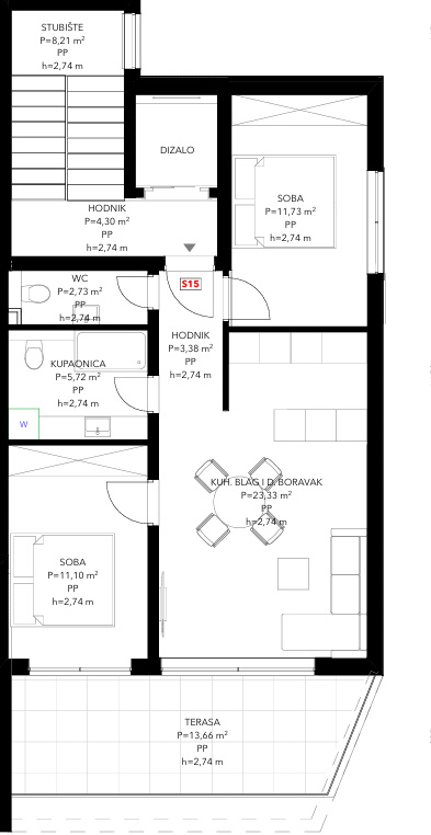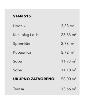 Stan S15 sastoji se od hodnika površine 3,38 m², kuhinje, blagovaonice i dnevnog boravka površine 23,33 m², spremišta od 2,73 m², kupaonice površine 5,72 m² te dvije sobe – jedna površine 11,73 m², a druga 11,10 m². Ukupna zatvorena površina stana iznosi 58,00 m², dok terasa ima 13,66 m². Stanu pripada jedno garažno parkirno mjesto.