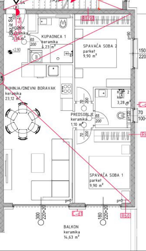 Unutarnja površina stana iznosi 54,83 m2, a terase 14,63m2.
