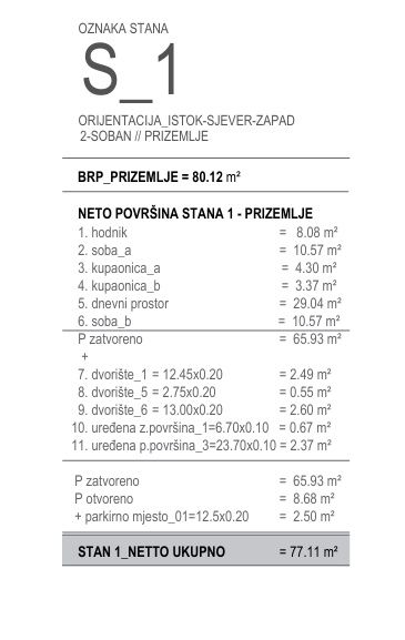 Unutarnja površina stana iznosi 65,93 m2, a površina vanjskog dijela ( terase i vrta ) 58,60 m2.
