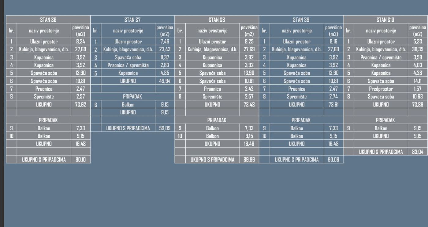 Unutarnja površina stana iznosi 73,89 m2 + 9,15 m2.