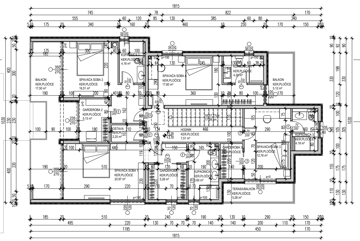 Na katu su smještene četiri elegantne spavaće sobe, svaka s vlastitom garderobom, kupaonicom i balkonom, što ovoj vili daje poseban osjećaj luksuza. Površina kata prostire se na 168 m².