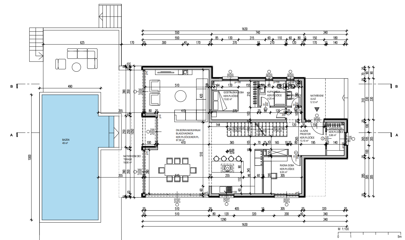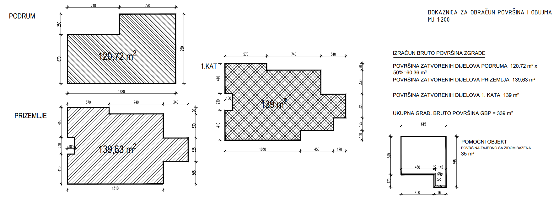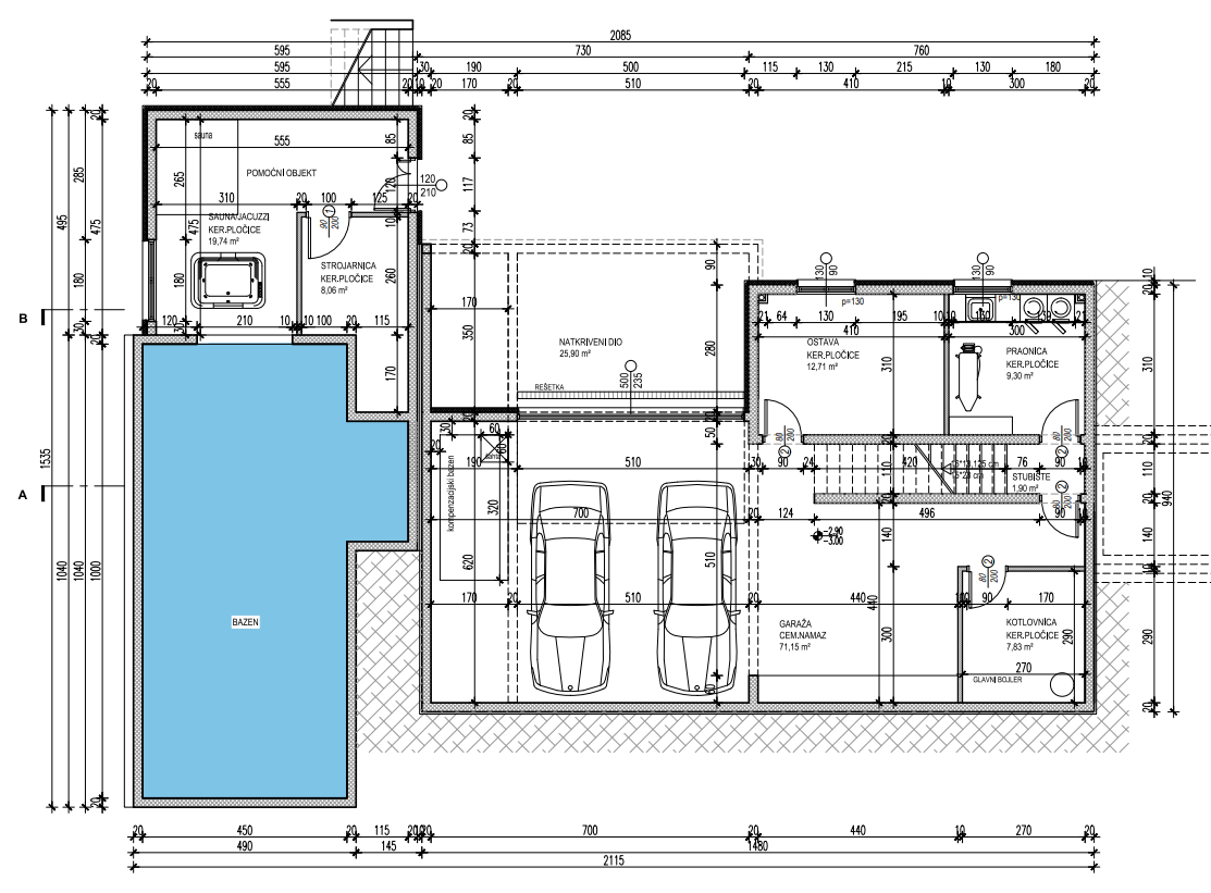 Na prvoj etaži nalazi se prostrani podrum, koji uključuje garažu, praonicu, ostavu te poseban prostor s ugrađenom saunom i jacuzzijem. Ukupna površina zatvorenog prostora na ovoj etaži iznosi 155 m², što pruža obilje prostora za funkcionalnost i udobnost.