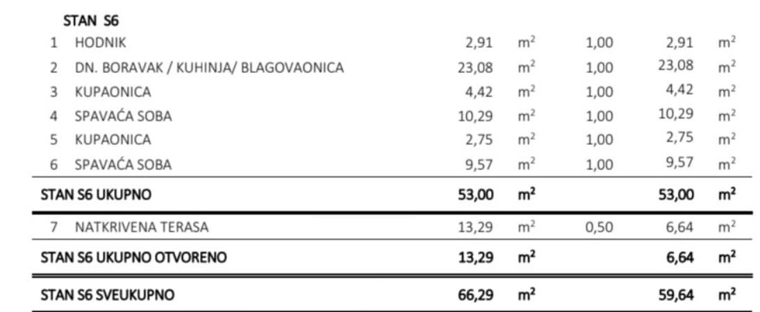 Unutarnja površina stana iznosi 53,00 m2, a terase 13,29 m2.