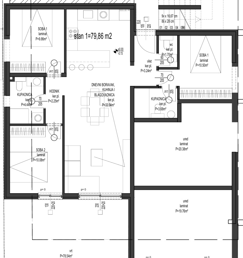 Unutarnja površina stana iznosi 79,86 m2, a terase 12 m2, a vrta 66,54 m2.