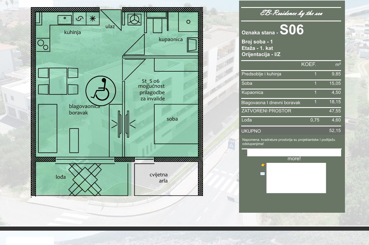 Na prodaju se stavlja stan oznake S06, smješten na 1. katu stambene zgrade u izgradnji. Stan se sastoji od ulaznog prostora s kuhinjom, blagovaonice i dnevnog boravka, jedne spavaće sobe, kupaonice te lođe. Ukupna obračunska površina stana iznosi 52,15 m², od čega 47,55 m² čini zatvoreni stambeni prostor, dok lođa površine 4,60 m² ulazi u obračun prema koeficijentu. Stan je orijentiran na istok i zapad.
