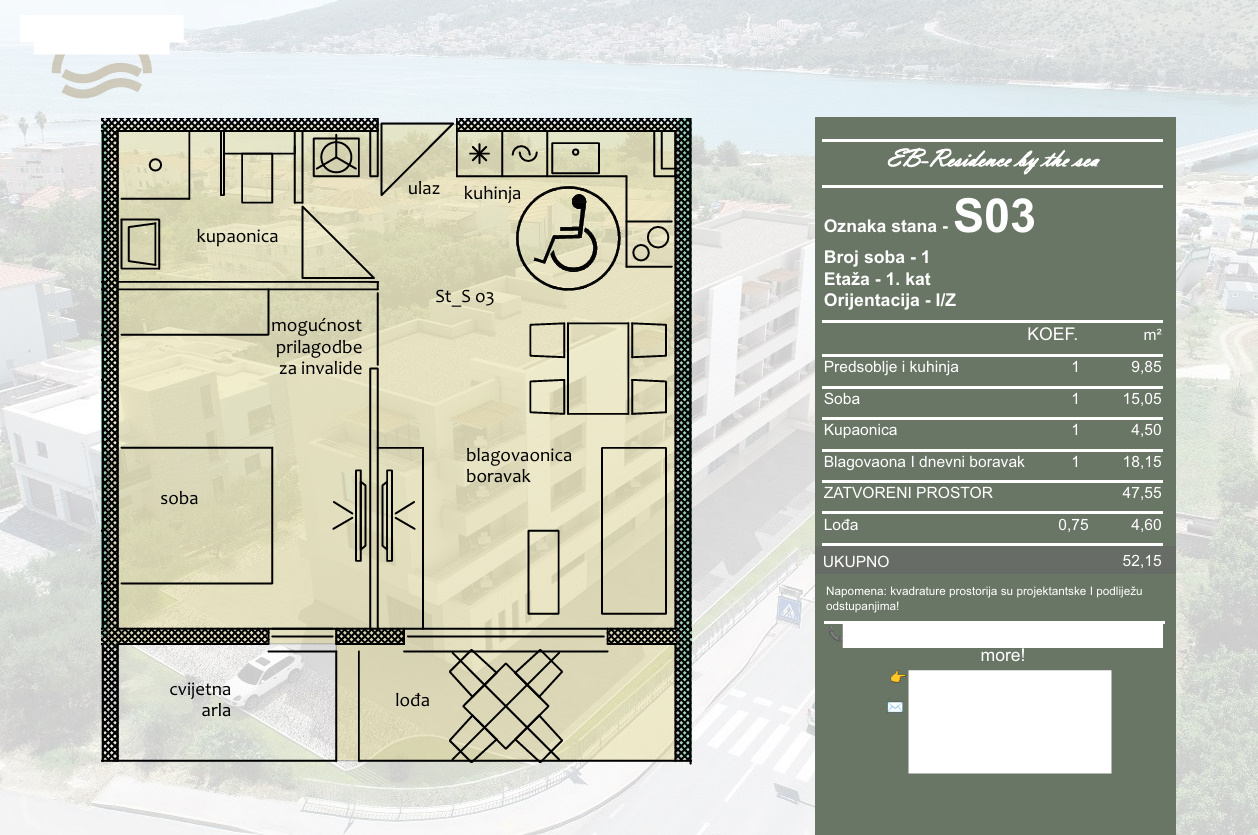 Na prodaju je moderan i funkcionalan jednosoban stan oznake S03, smješten na prvom katu suvremene stambene zgrade, u mirnom okruženju i u blizini mora. Stan se sastoji od ulaznog prostora s kuhinjom, blagovaonice i dnevnog boravka s izlazom na lođu, jedne spavaće sobe te kupaonice. Ukupna obračunska površina stana iznosi 52,15 m², od čega je 47,55 m² zatvorenog stambenog prostora, dok lođa površine 4,60 m² dodatno doprinosi ugodnom boravku i osjećaju prozračnosti. Stan je orijentiran na istok i zapad, što mu osigurava dobru osvijetljenost tijekom dana.