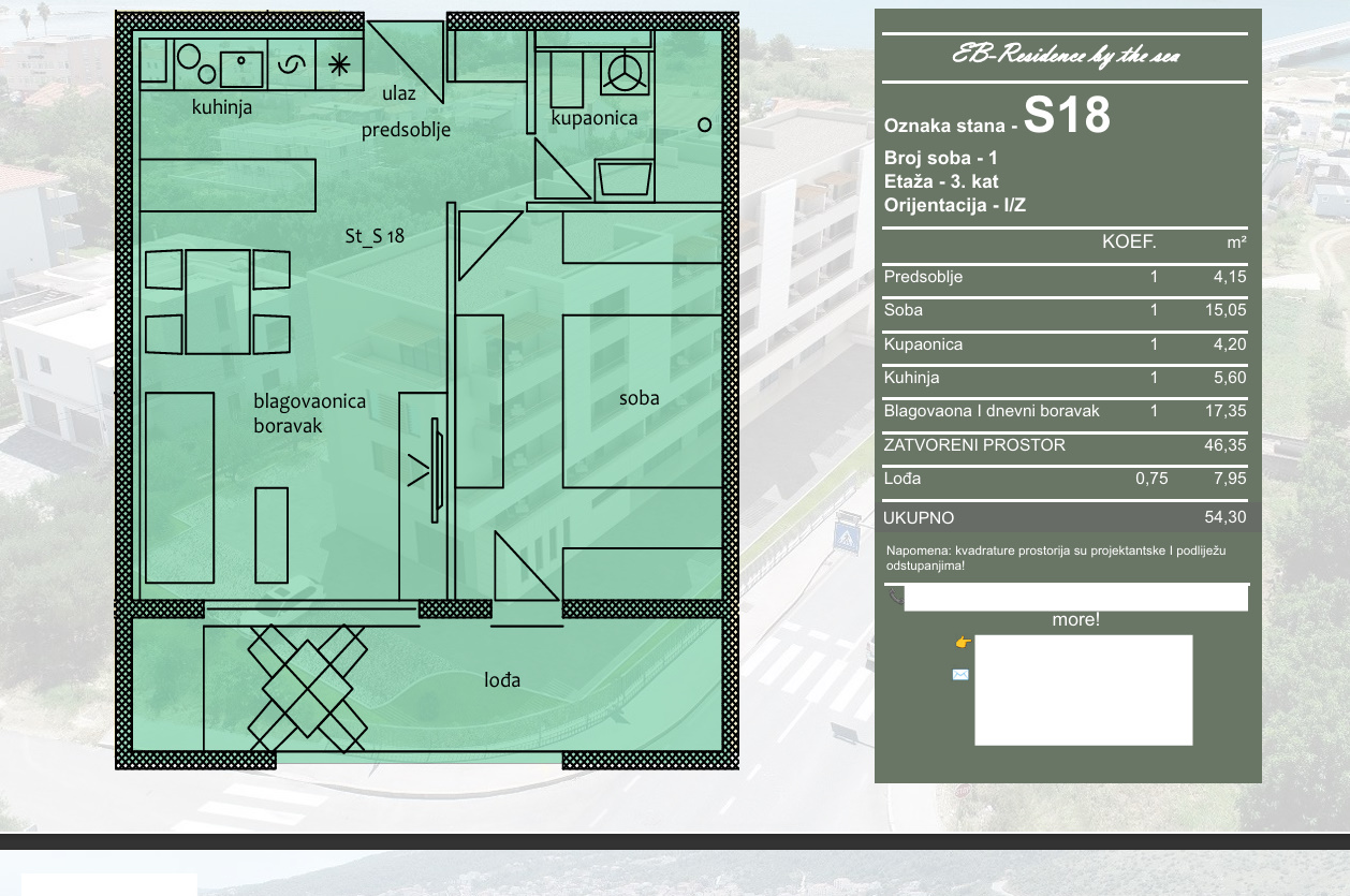 Na prodaju se stavlja stan oznake S18, smješten na 3. katu stambene zgrade u izgradnji. Stan se sastoji od predsoblja, kuhinje, blagovaonice i dnevnog boravka, jedne spavaće sobe, kupaonice te lođe. Ukupna obračunska površina stana iznosi 54,30 m², od čega 46,35 m² čini zatvoreni stambeni prostor, dok lođa površine 7,95 m² ulazi u obračun prema koeficijentu. Stan je orijentiran na istok i zapad.
