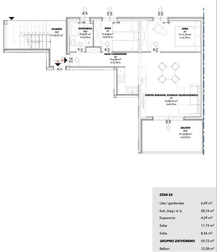 Unutarnja površina stana iznosi 59,72 m2, a natkrivene terase 12,08 m2.
