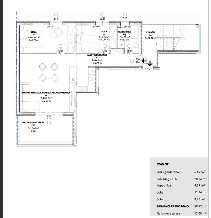 Unutarnja površina stana iznosi 59,72 m2, a natkrivene terase 12,08 m2.