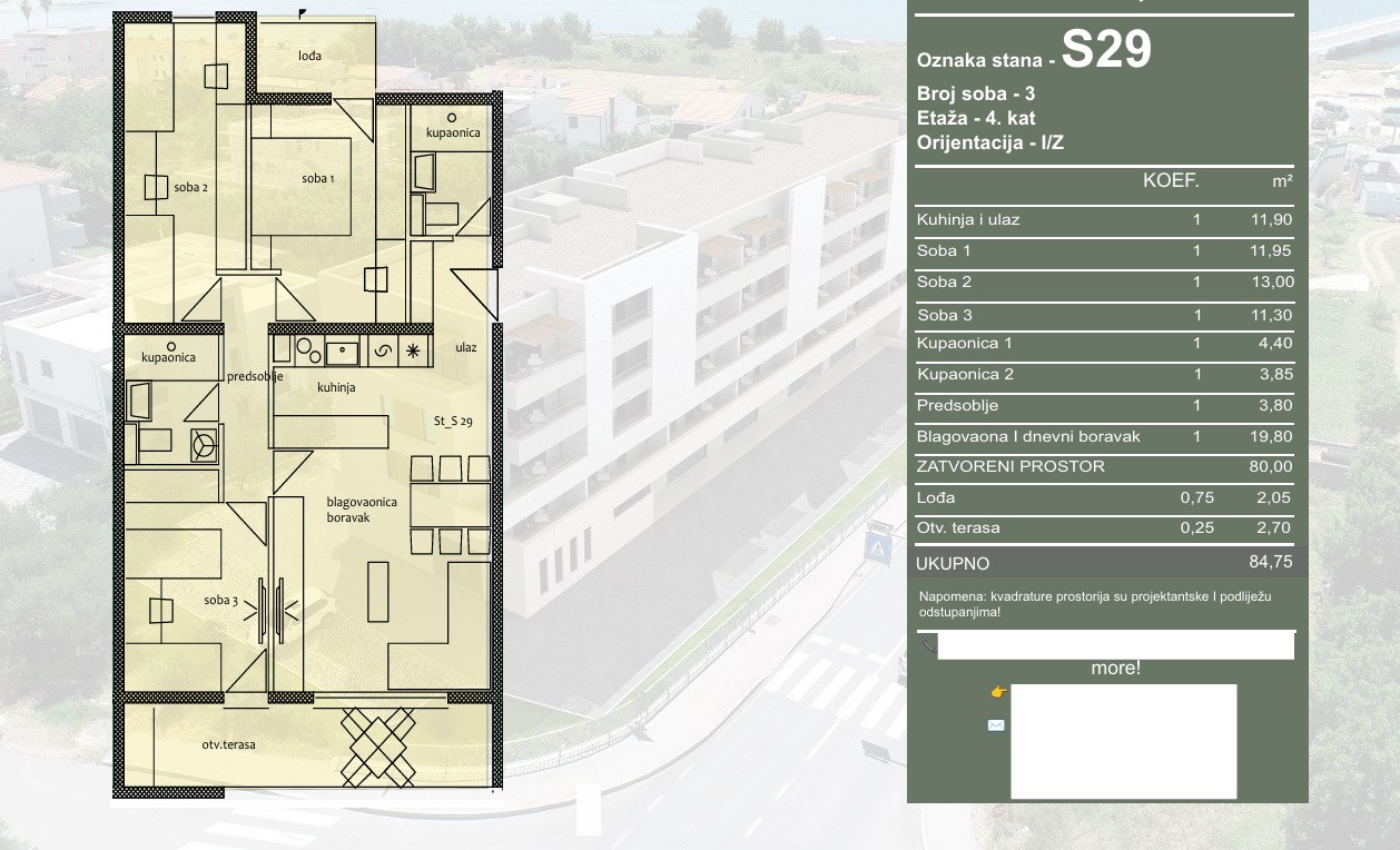Na prodaju se stavlja stan oznake S29, smješten na 4. katu stambene zgrade u izgradnji. Stan se sastoji od ulaza i kuhinje, predsoblja, blagovaonice i dnevnog boravka, tri spavaće sobe, dvije kupaonice, lođe te otvorene terase. Ukupna obračunska površina stana iznosi 84,75 m², od čega 80,00 m² čini zatvoreni stambeni prostor, dok lođa obračunske površine 2,05 m² i otvorena terasa obračunske površine 2,70 m² ulaze u obračun prema koeficijentu. Stan je orijentiran na istok i zapad.