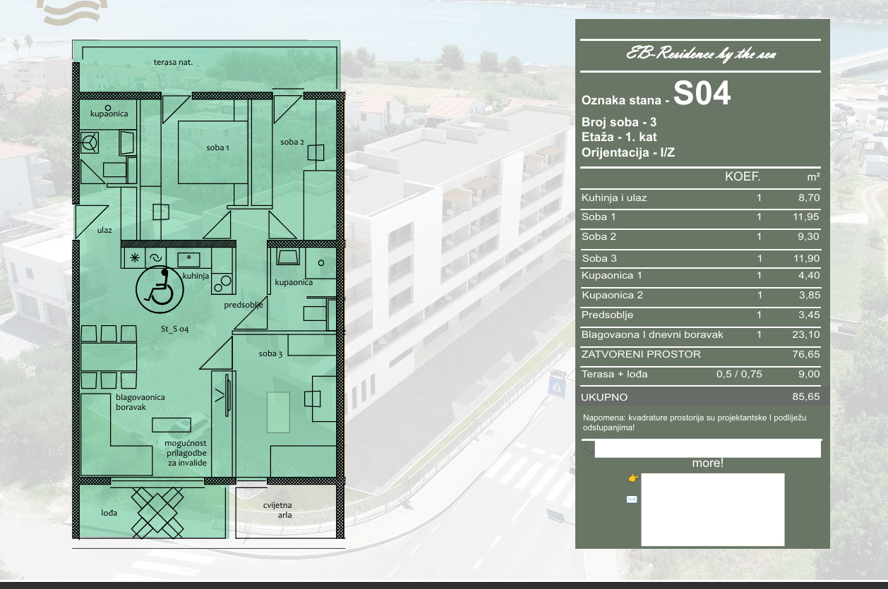 Na prodaju se stavlja stan oznake S04, smješten na 1. katu stambene zgrade u izgradnji. Stan se sastoji od ulaza i kuhinje, predsoblja, blagovaonice i dnevnog boravka, tri spavaće sobe, dvije kupaonice, lođe i terase. Ukupna obračunska površina stana iznosi 85,65 m², od čega 76,65 m² čini zatvoreni stambeni prostor, dok terasa i lođa ukupne površine 9,00 m² ulaze u obračun prema koeficijentu. Stan je orijentiran na istok i zapad.