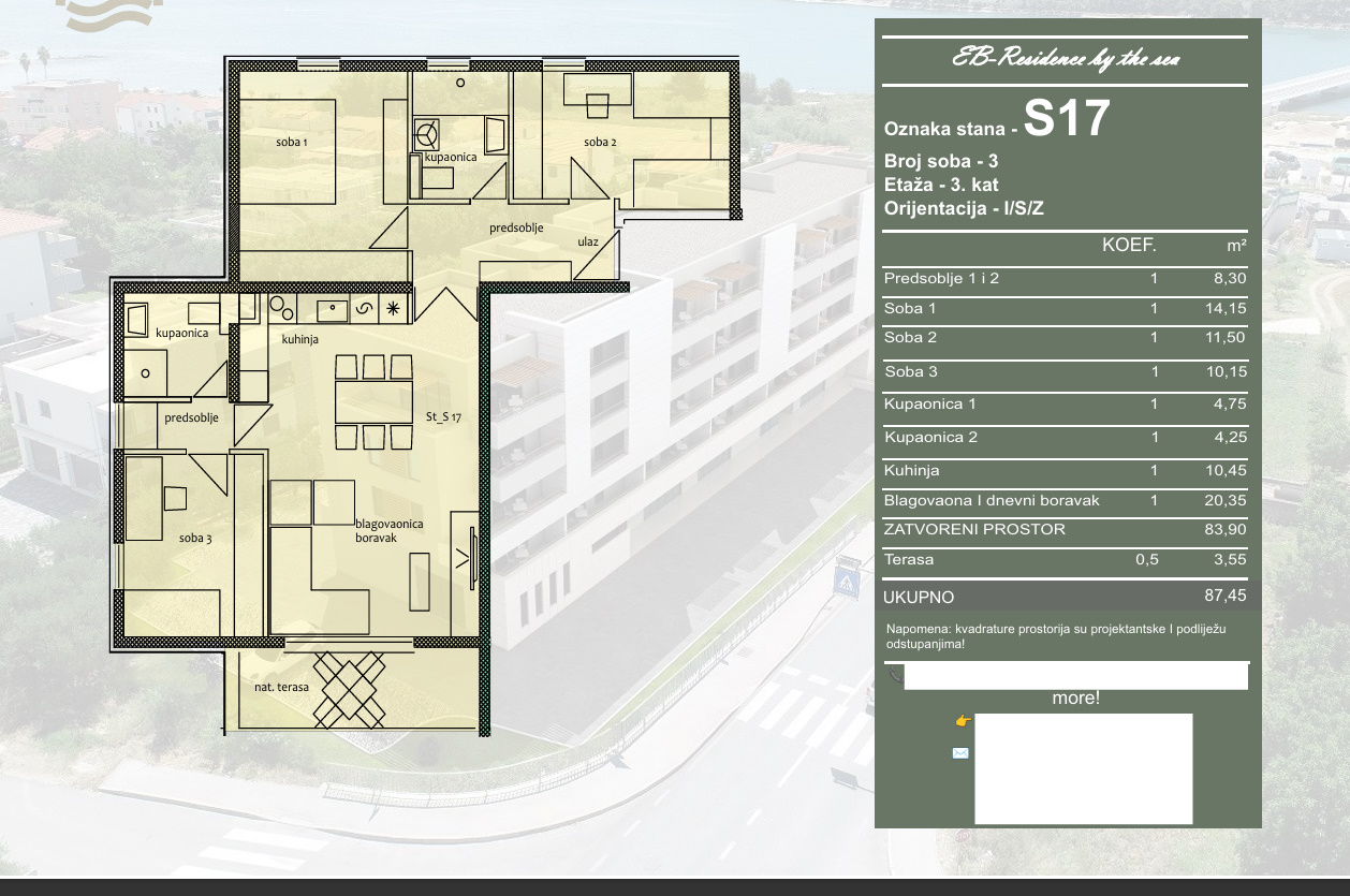 Na prodaju se stavlja stan oznake S17, smješten na 3. katu stambene zgrade u izgradnji. Stan se sastoji od predsoblja, kuhinje, blagovaonice i dnevnog boravka, tri spavaće sobe, dvije kupaonice te terase. Ukupna obračunska površina stana iznosi 87,45 m², od čega 83,90 m² čini zatvoreni stambeni prostor, dok terasa površine 3,55 m² ulazi u obračun prema koeficijentu. Stan je orijentiran na istok, jug i zapad.